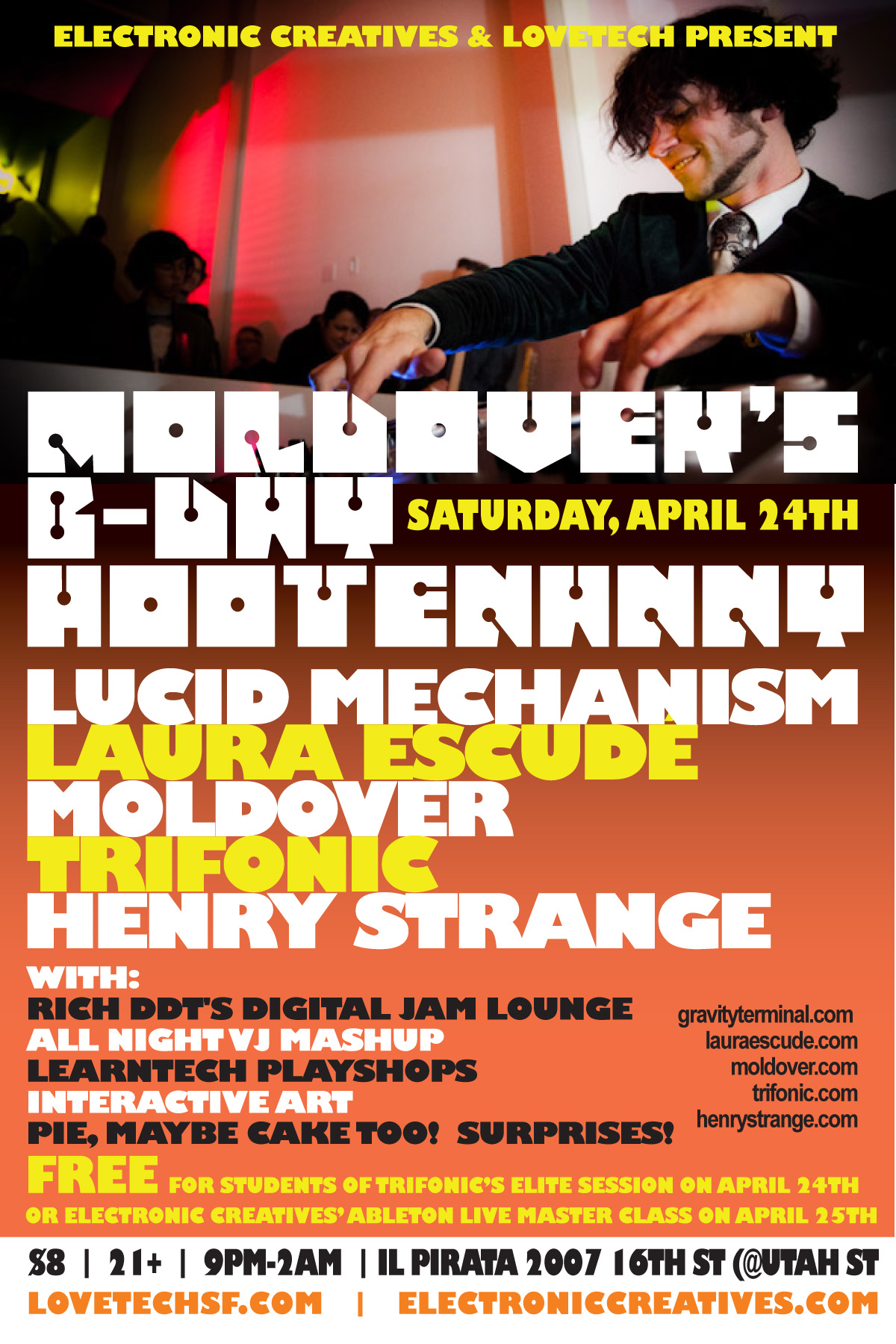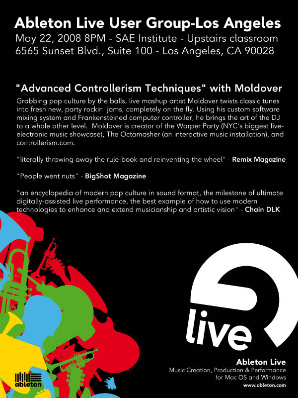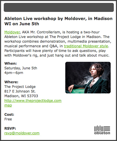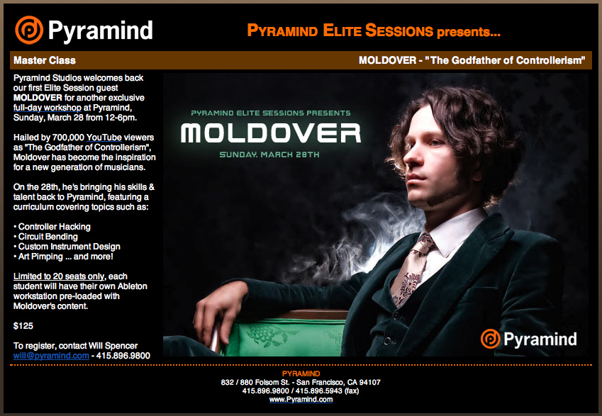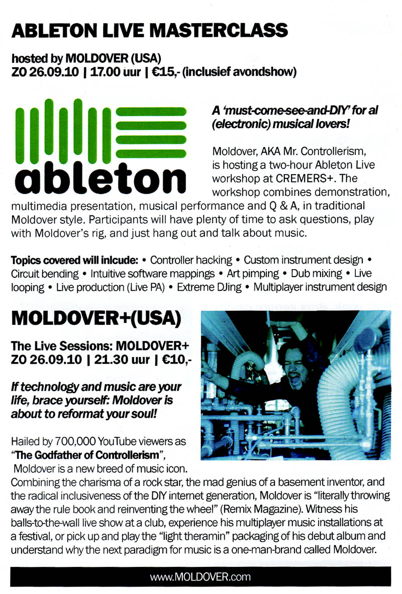 Moldover, AKA Mr. Controllerism, is hosting a two-hour Ableton Live workshop at CREMERS+. The workshop combines demonstration, multimedia presentation, musical performance and Q & A, in traditional Moldover style. Participants will have plenty of time to ask questions, play with Moldover's rig, and just hang out and talk about music.