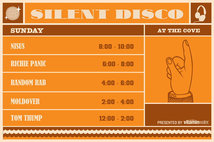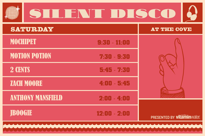 DJ set at the Silent Disco with Mochipet, Motion Potion, Two Cents, Zach Moore, Anthony Mansfield, JBoogie, Nisus, Richie Panic, Random Rab, and Tom Thump.